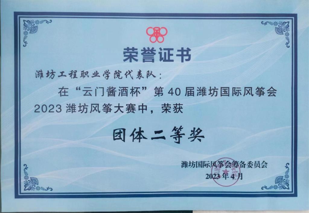 近日,第40届潍坊国际风筝会2023潍坊风筝大赛结果公布,潍坊工程职业学院获团体二等奖的好成绩。